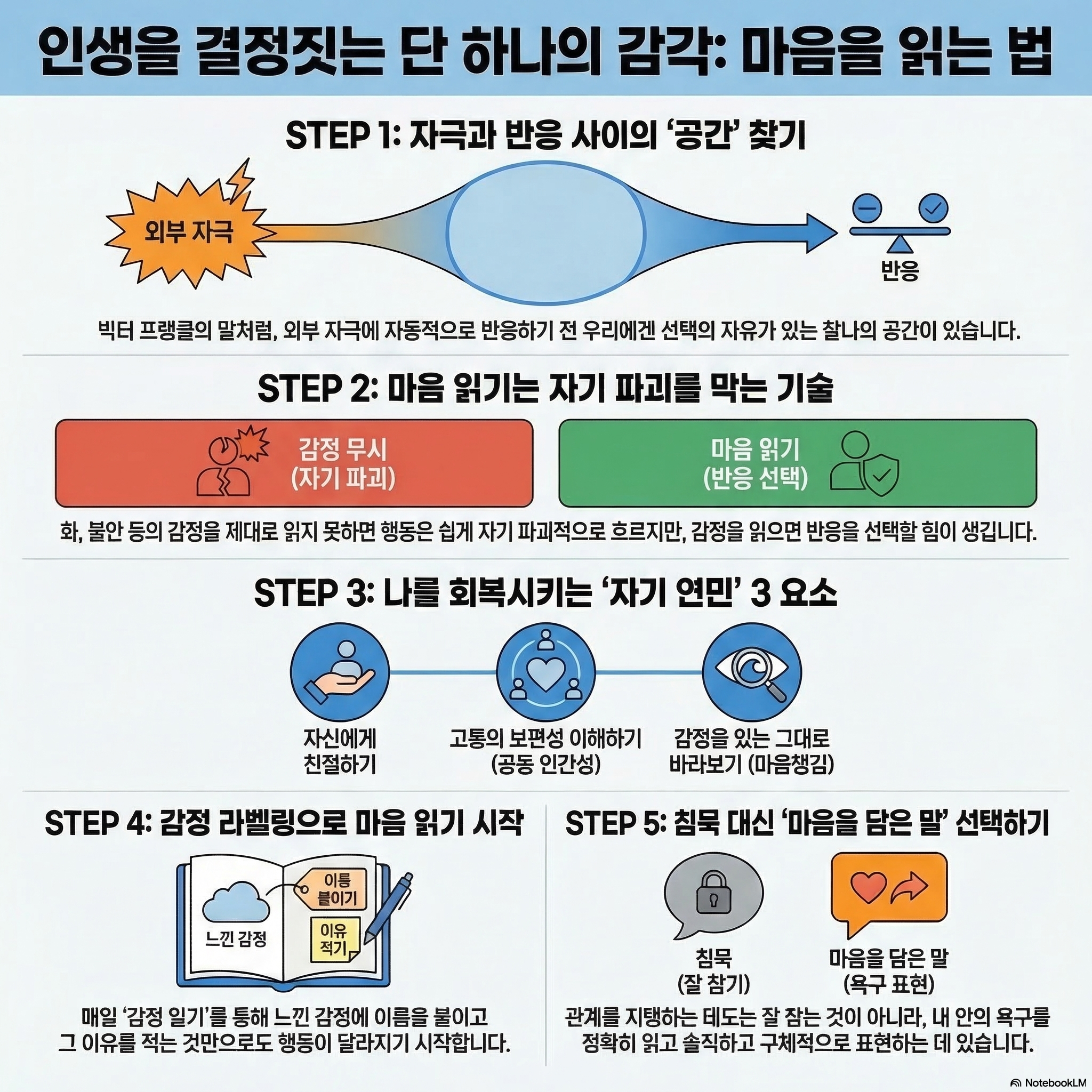 많은 사람이 마음 읽기를 단순히 감정을 부드럽게 표현하는 대화 기술 정도로 생각합니다. 하지만 본질적인 의미에서 마음 읽기는 나를 해치는 ‘자기 파괴적 행동’을 막는 실질적인 생존 전략입니다.