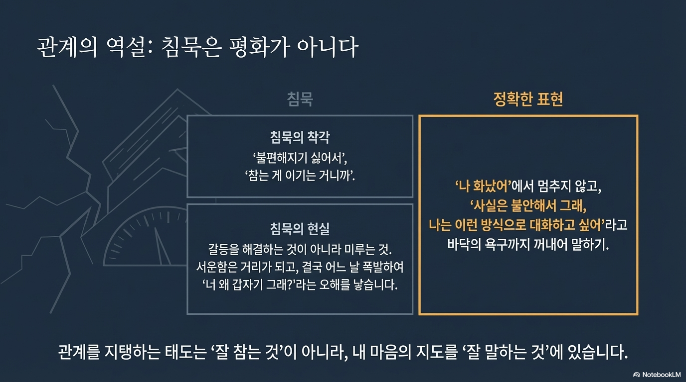 흔히 갈등을 피하기 위해 입을 닫는 쪽을 선택하곤 합니다. 하지만 침묵은 갈등을 해결하는 것이 아니라 뒤로 미루는 것일 뿐입니다. 관계는 큰 폭발이 아니라 '말하지 않음'으로써 생기는 작은 금에서부터 서서히 무너집니다.