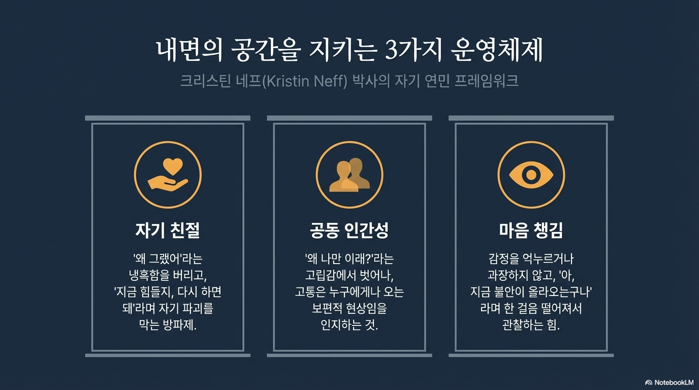 크리스틴 네프 박사의 연구에 따르면, 사람을 진정으로 무너뜨리는 것은 실패 그 자체가 아니라 ‘실패한 나를 대하는 가혹한 태도’입니다. 그녀는 나를 비난하기보다 연민하는 태도가 회복탄력성을 높인다고 강조하며 세 가지 핵심 요소를 제시합니다.