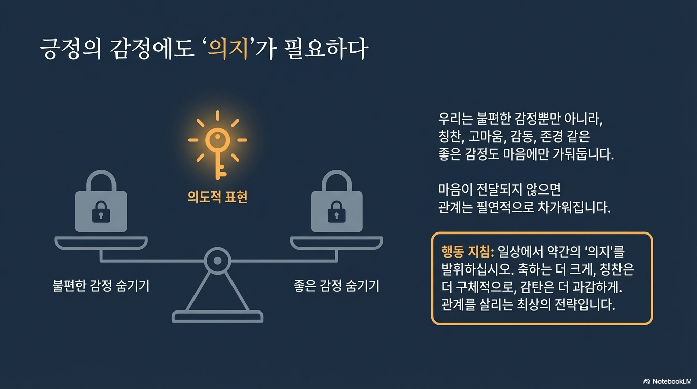 더불어 긍정적인 감정은 의지적으로 표현해야 합니다. 한국적인 맥락에서 쑥스럽다는 이유로 생략하기 쉬운 표현들을 다음의 공식을 활용해 더 적극적으로 건네보세요. 축하는 더 크게, 칭찬은 더 구체적으로, 그리고 감탄은 더 과감하게. 이 어색함을 무릅쓰는 태도가 관계를 따뜻하게 유지하는 비결입니다.
