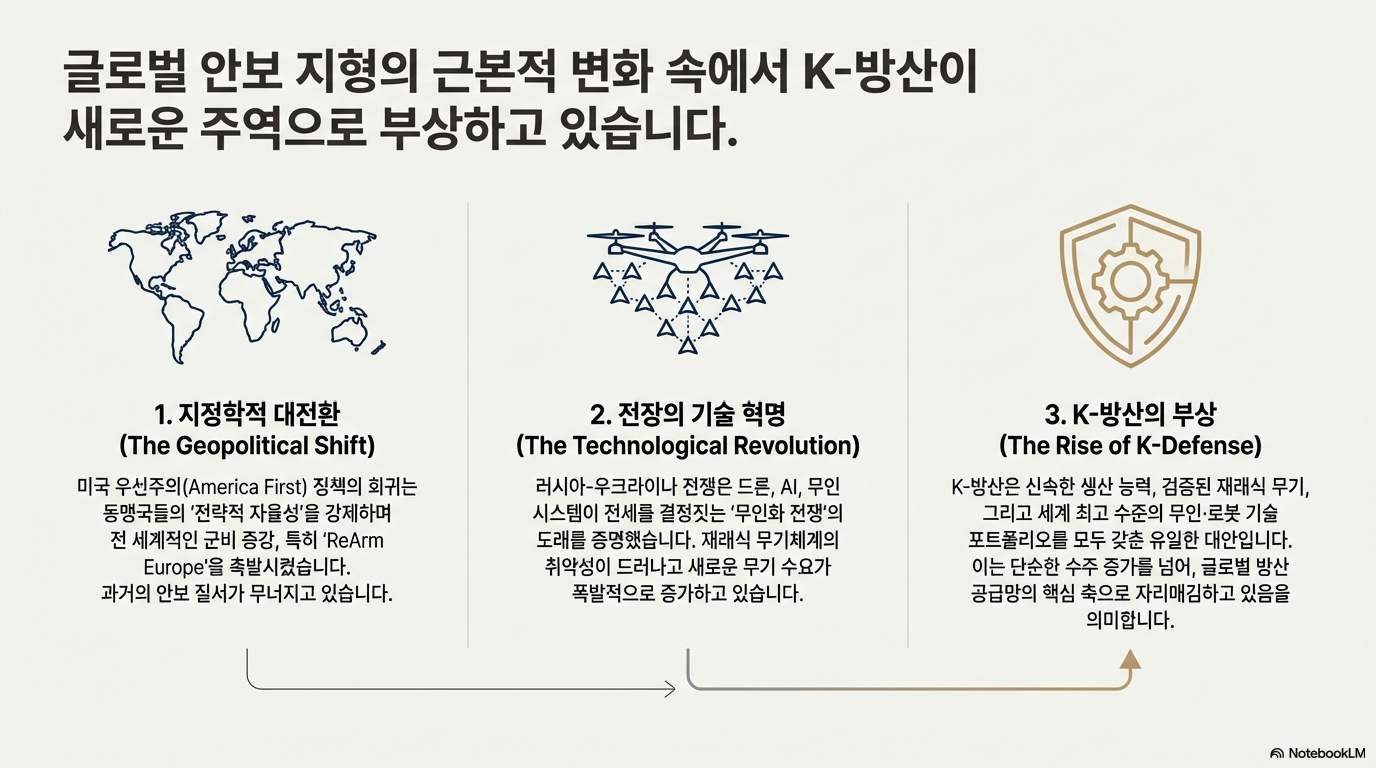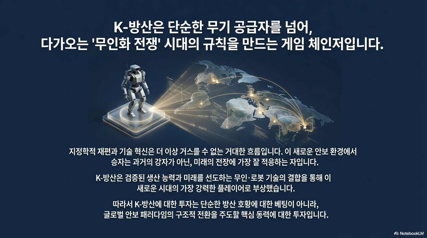 K-방산의 성공 신화는 단발적인 사건이 아니라, 현대전의 진화, 지정학적 균열, 그리고 산업 전략의 근본적 전환이 맞물려 나타난 필연적 결과다. 전차의 역할 재정립과 AI 기반 군사 혁신에서부터 유럽의 생산 공백과 신흥 안보 시장의 부상에 이르기까지, 이 모든 변화는 하나의 방향을 가리키고 있다. 세계 국방 시장의 승자는 더 이상 최고의 하드웨어를 만드는 국가가 아니다. 속도, 기술 통합, 그리고 깊은 신뢰에 기반한 포괄적인 솔루션을 제공하는 국가가 새로운 시대를 주도할 것이다.