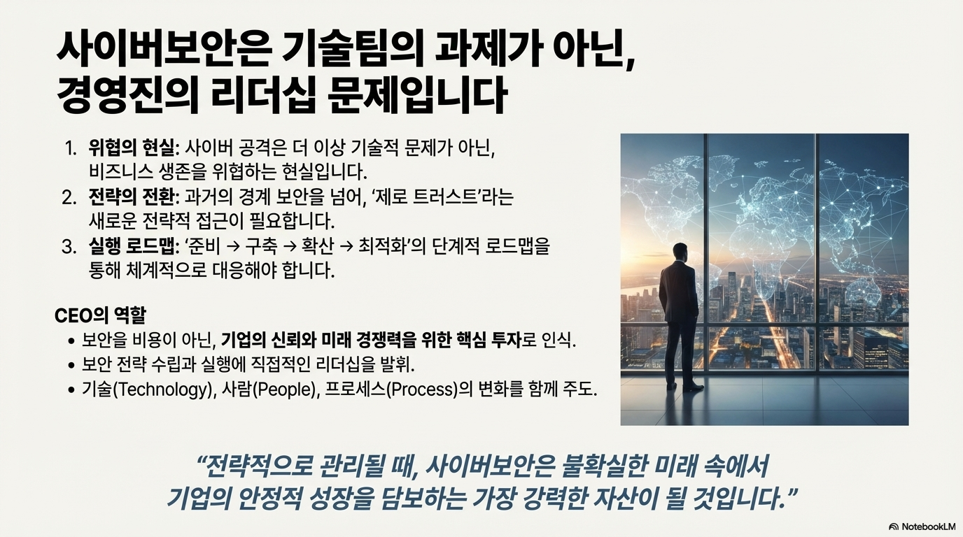 지금까지 살펴본 5가지 변화—사이버 공격의 무기화, 범죄의 산업화, 오픈소스 공급망의 위협, AI의 악용, 그리고 제로 트러스트로의 전환—는 우리에게 한 가지 분명한 사실을 말해줍니다. 사이버 보안은 더 이상 IT 부서나 기술팀만의 책임이 아닙니다. 이는 기업의 평판과 신뢰, 나아가 개인의 안전과 생존을 좌우하는 핵심 전략이 되었습니다.