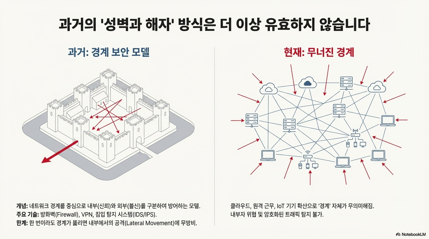하지만 클라우드 서비스가 보편화되고, 원격 근무와 하이브리드 업무 환경이 일상이 되면서 이 ‘경계’는 사실상 무의미해졌습니다. 이제 데이터와 사용자는 성 안팎을 자유롭게 오가는데, 낡은 성벽에만 의존할 수는 없는 노릇입니다.