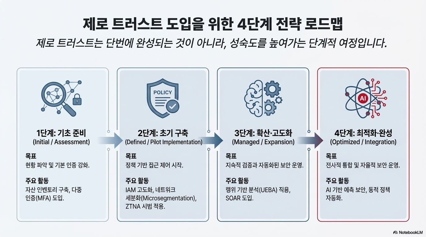 이에 대한 대안으로 등장한 것이 바로 ‘제로 트러스트(Zero Trust)’ 보안 모델입니다. 이 모델의 핵심 철학은 매우 단순하고 강력합니다.