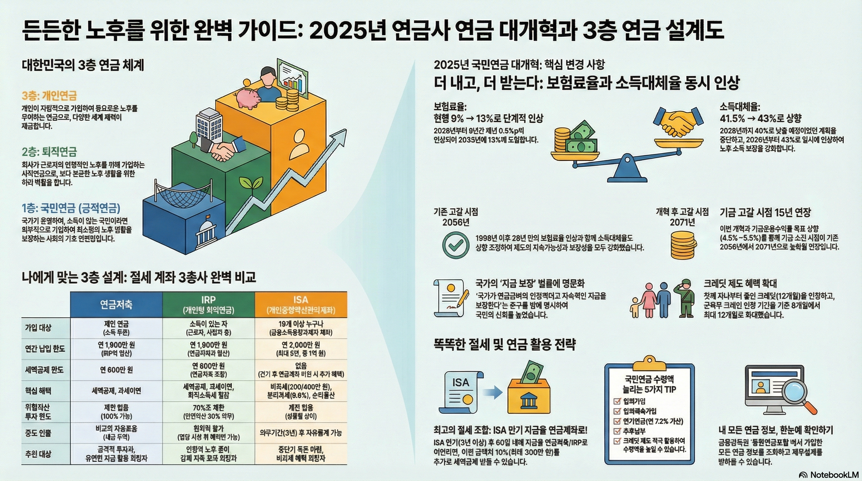 2025년부터 국민연금 보험료율이 현행 9%에서 단계적으로 12~13%로 인상되고 수급 연령도 상향 조정되는 등, 미래 세대의 부담은 커지고 있습니다. 이러한 변화 속에서 국민연금에만 의존할 수 없으며, 세대별로 다른 사적연금 준비 전략이 반드시 필요합니다.