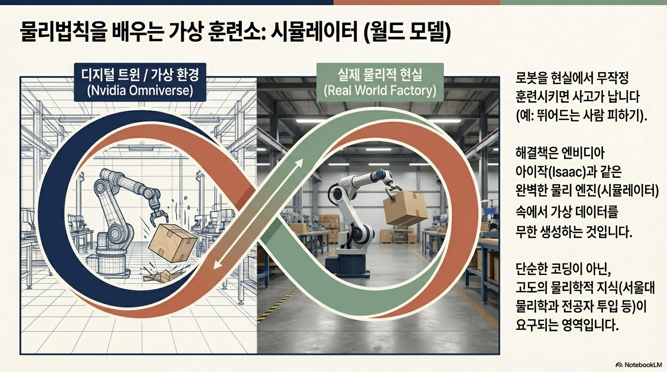 엔비디아의 '옴니버스'나 '아이작' 같은 플랫폼은 가상 세계에 물리 법칙을 완벽히 구현합니다. 로봇은 이 안에서 수만 번의 시행착오를 겪으며 물리적 상식을 배웁니다. 이는 고차원적인 물리학 공식을 외우는 것이 아닙니다. 5살 아이도 본능적으로 아는 **"접시는 떨어지면 깨진다"**거나 **"사람이 나타나면 멈춰야 한다"**는 수준의 상식을 체득하는 과정입니다. 가상 세계에서 '물리적 지능'을 먼저 완성한 로봇이 현실로 걸어 나오게 되는 것입니다.