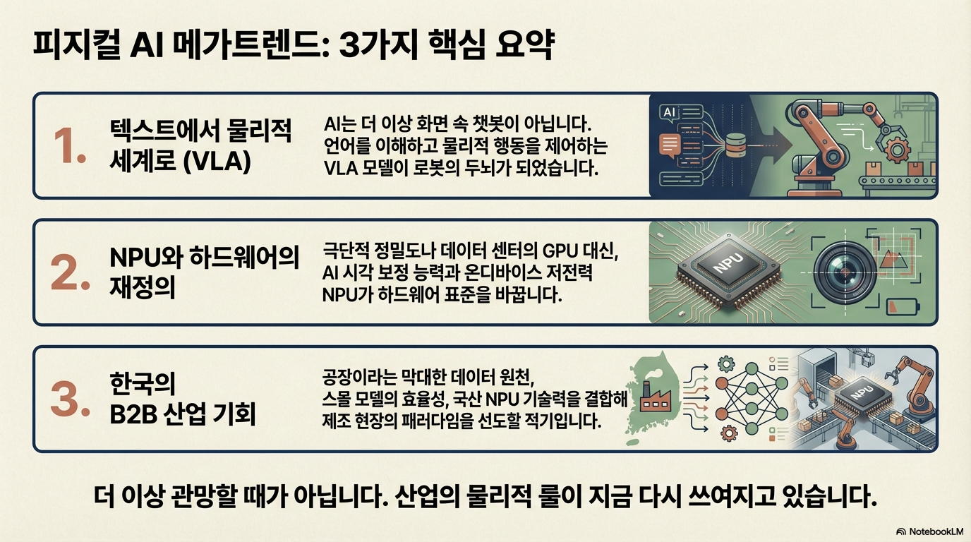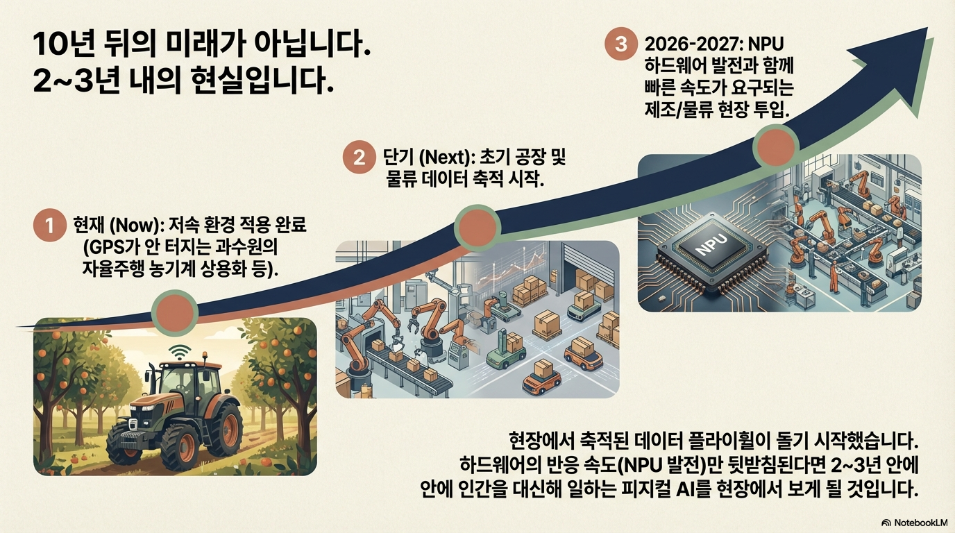 피지컬 AI는 더 이상 공상과학 영화 속 이야기가 아닙니다. 앞으로 2~3년 내에 우리는 공장에서 사람과 나란히 부품을 조립하고, 물류 창고에서 복잡한 적재 업무를 수행하는 '말귀 알아듣는 로봇'들을 일상적으로 마주하게 될 것입니다.