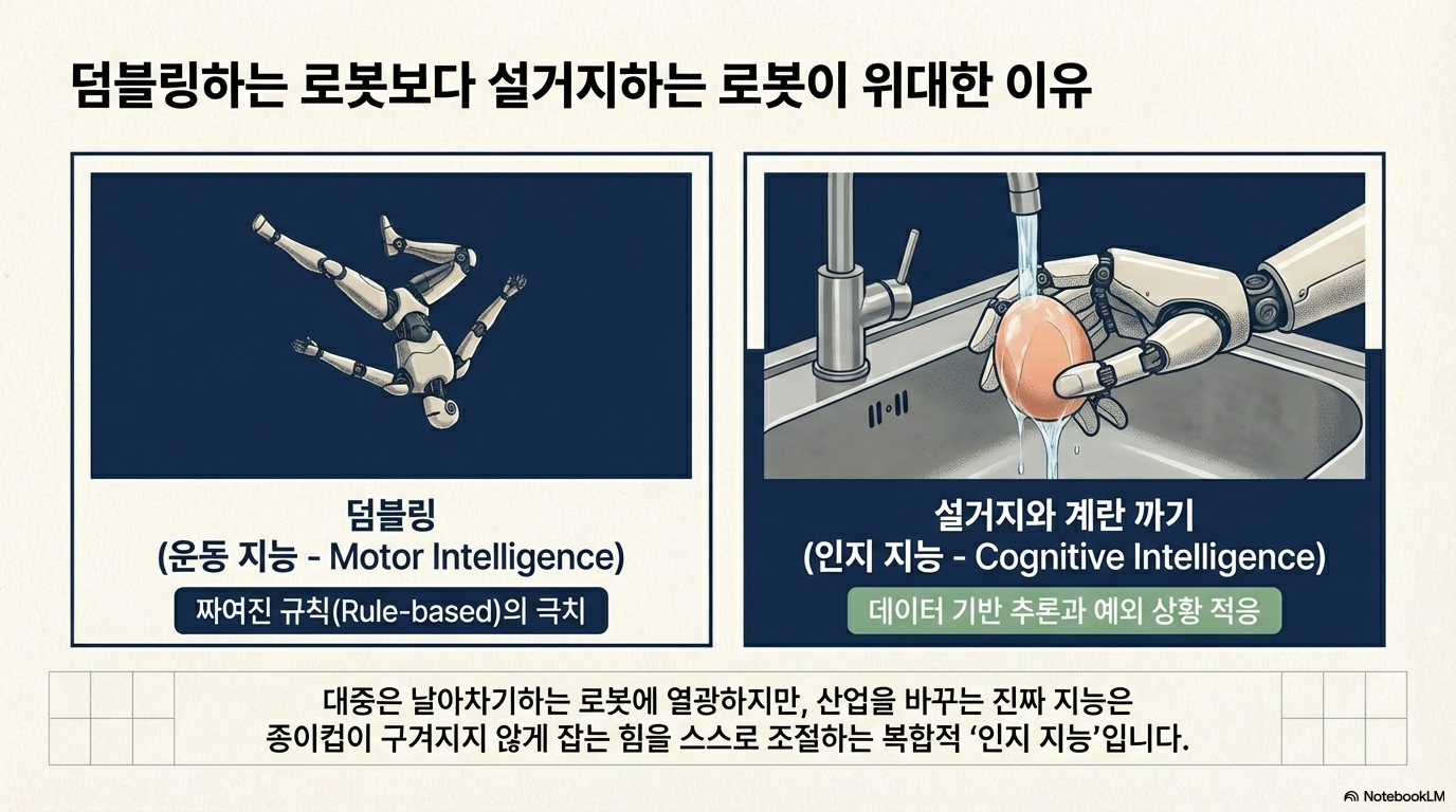 우리는 흔히 화려한 백덤블링을 하거나 쿵푸 동작을 선보이는 로봇 영상에 감탄하곤 합니다. 하지만 냉정하게 말해, 백덤블링하는 로봇은 사전에 짜여진 궤적을 반복하는 '서커스 단원'에 가깝습니다. 피지컬 AI가 지향하는 진정한 지능은 오히려 아주 천천히 **'계란 껍질을 까는 손가락'**에서 드러납니다.