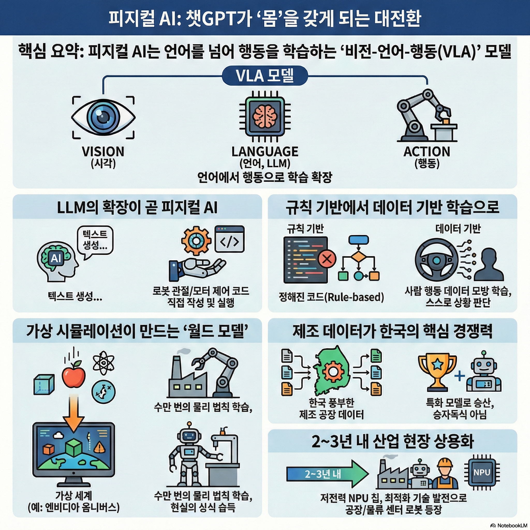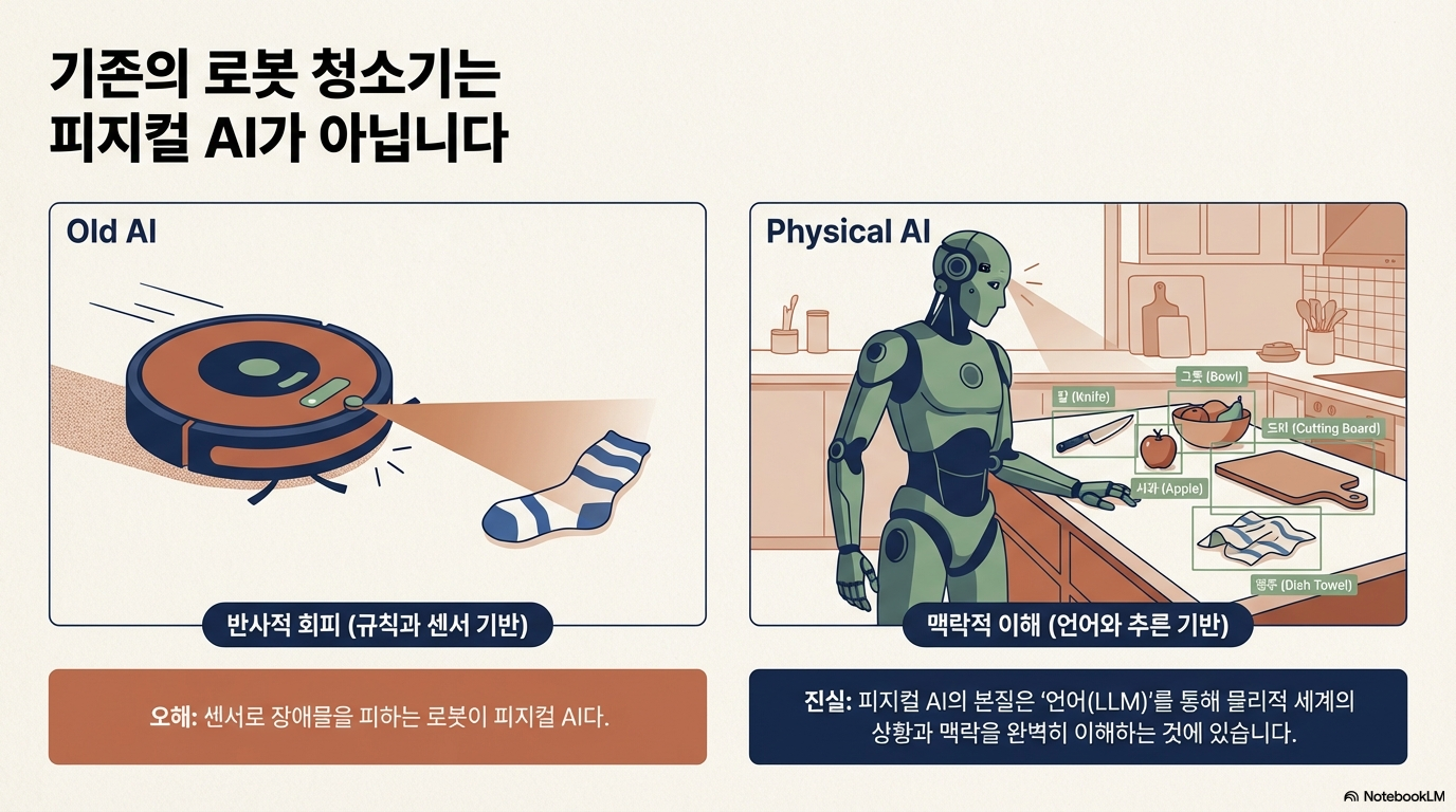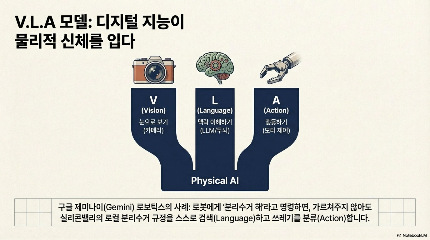 피지컬 AI의 핵심 정체성은 **'VLA(Vision-Language-Action) 모델'**에 있습니다. 이는 단순히 눈(Vision)으로 보고 움직이는 것을 넘어, 언어(Language)를 통해 세상의 맥락과 상식을 이해한 뒤 행동(Action)하는 모델을 뜻합니다.