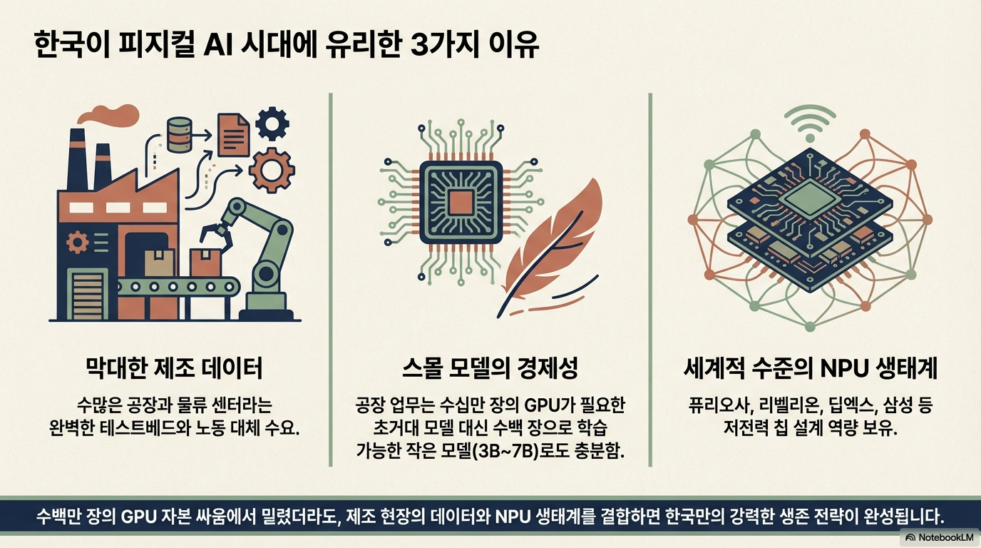 자본 싸움에서는 밀릴지 몰라도, 특화된 제조 데이터와 최적화된 AI 모델이 결합한다면 피지컬 AI는 한국 산업의 거대한 돌파구가 될 것입니다.