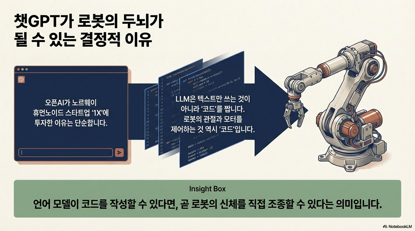 우리는 지금 화면 속 텍스트와 이미지로 소통하는 인공지능의 시대를 지나고 있습니다. 챗GPT가 선사한 지적 충격은 대단했지만, 여전히 AI는 물리적 실체가 없는 '상자 속의 두뇌'에 머물러 있습니다. 그런데 만약 이 강력한 언어 모델이 현실 세계를 직접 만지고, 걷고, 상호작용할 수 있는 '몸'을 갖게 된다면 어떨까요?