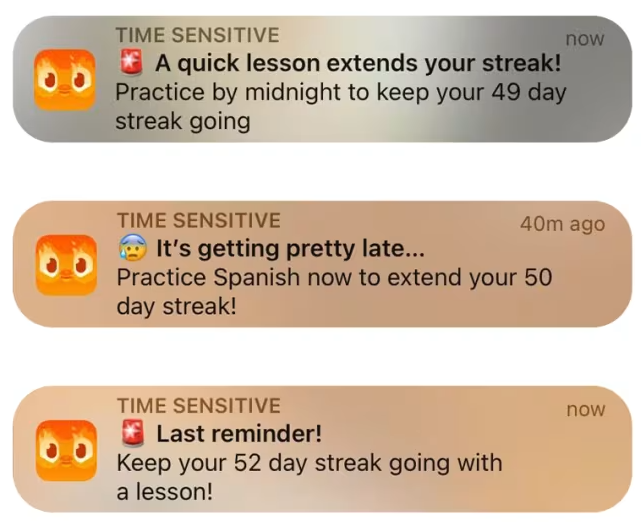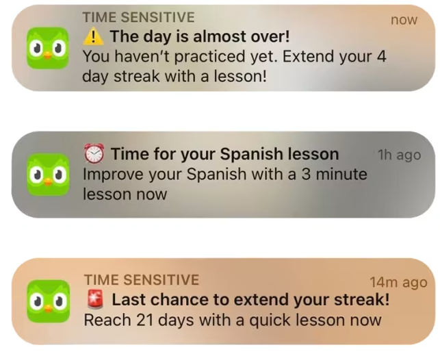 Duolingo의 성공 비결 중 하나는 스트릭(streak)과 알림(notification)에 있다. 스트릭은 사용자가 연속으로 며칠 동안 활동을 지속할 때 생기는 일종의 기록으로, 이를 끊지 않으려는 심리적 동기를 제공한다. 알림은 사용자가 잠시 앱을 떠나 있을 때 다시 돌아오도록 유도하는 역할을 한다. Duolingo는 이런 스트릭과 알림을 절묘하게 결합하여 사람들의 참여를 유지하는 데 성공했다.