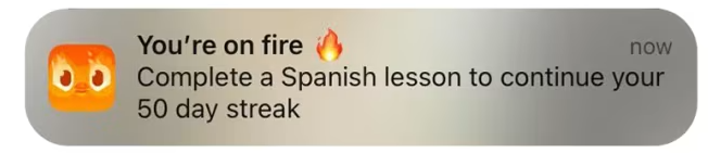 Duolingo의 성공 비결 중 하나는 스트릭(streak)과 알림(notification)에 있다. 스트릭은 사용자가 연속으로 며칠 동안 활동을 지속할 때 생기는 일종의 기록으로, 이를 끊지 않으려는 심리적 동기를 제공한다. 알림은 사용자가 잠시 앱을 떠나 있을 때 다시 돌아오도록 유도하는 역할을 한다. Duolingo는 이런 스트릭과 알림을 절묘하게 결합하여 사람들의 참여를 유지하는 데 성공했다.