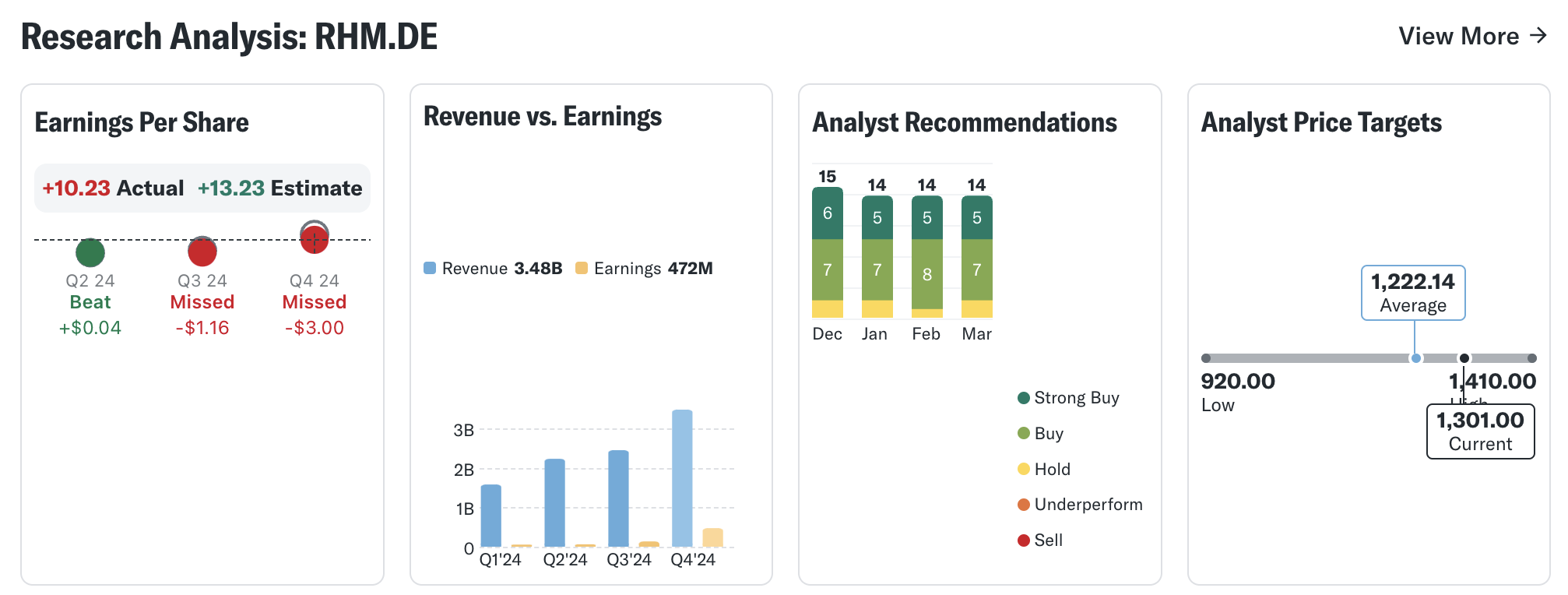 유럽이 재무장의 시대로 들어서면서, 방위산업은 새로운 황금기를 맞이하고 있다. 라인메탈은 탄약, 전투 차량, 공중 방어 시스템 등 다양한 제품군에서 유럽의 국방 예산 증가에 따른 직접적인 혜택을 누리고 있으며, 생산 역량 확충을 위한 전략적 투자도 활발하게 진행 중이다.