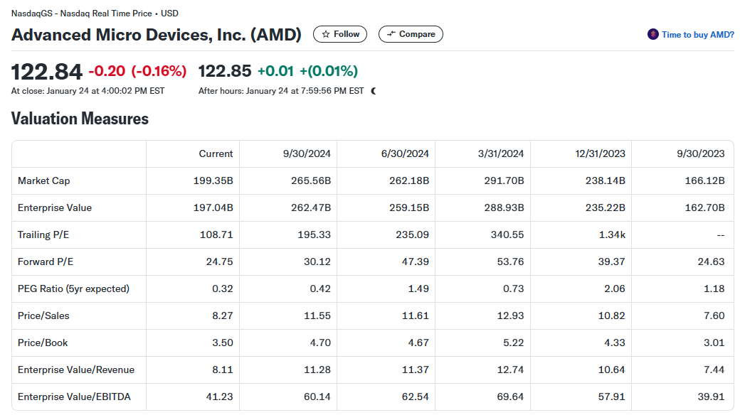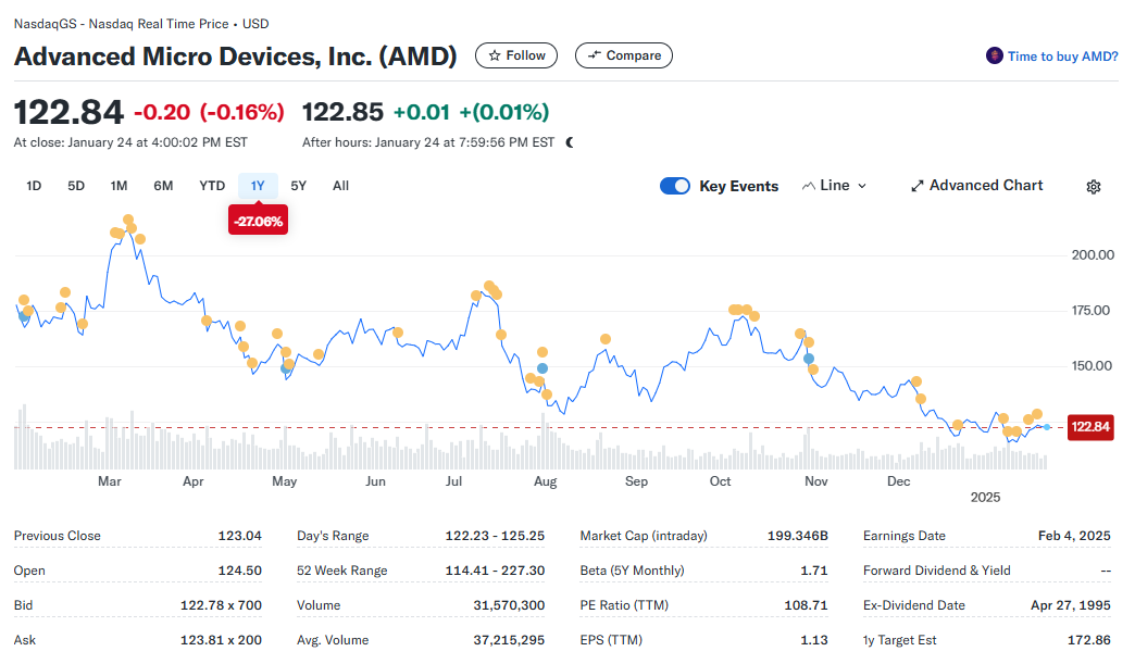 AMD는 기술 업계에서 인공지능(AI), 머신러닝, 클라우드 컴퓨팅 등의 급성장하는 시장을 기반으로 한 반도체 설계 및 제조 기업입니다. 특히 AMD의 **중앙처리장치(CPU)**와 **그래픽처리장치(GPU)**는 AI 및 데이터 처리에서 중요한 역할을 담당하며, 이를 통해 AI 기술 확산의 핵심 기업 중 하나로 자리 잡고 있습니다. 그러나 AMD는 2024년 주가가 약 18% 하락하는 어려움을 겪었으며, 이는 시장 내 경쟁 심화와 Nvidia의 압도적인 점유율 때문이었습니다. Nvidia는 AI 칩 시장에서 거의 독점적인 지위를 가지고 있으며, 이는 AMD가 AI와 머신러닝의 성장성을 온전히 활용하는 데 있어 주요 장애물로 작용하고 있습니다.