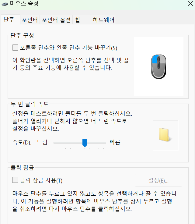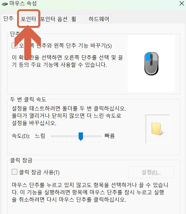 - '마우스 속성(Mouse Properties)' 창이 열립니다.