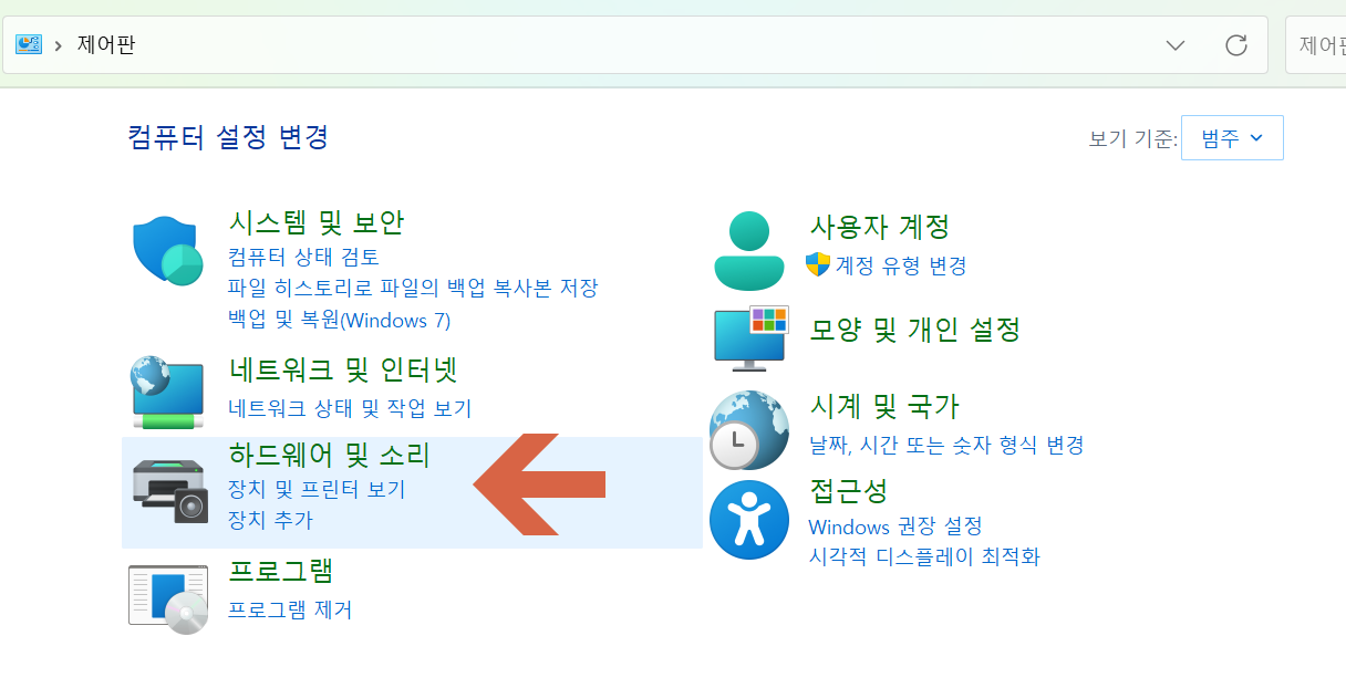 - '하드웨어 및 소리(Hardware and Sound)' 섹션을 찾아 클릭합니다.