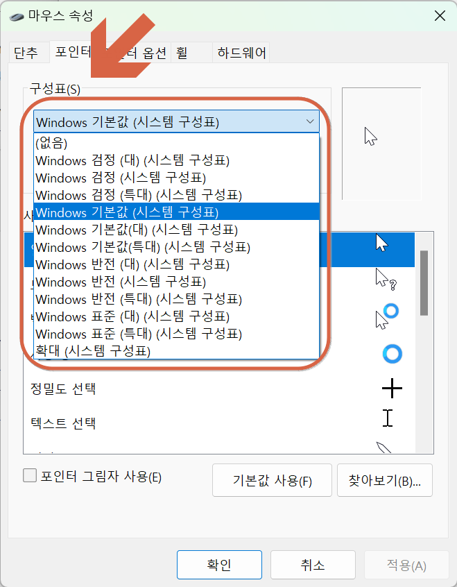 - '구성표 (Scheme)' 드롭다운 메뉴에서 사용하고 싶은 마우스 포인터 스타일을 선택합니다. Windows는 다양한 기본 포인터 스킴을 제공합니다.