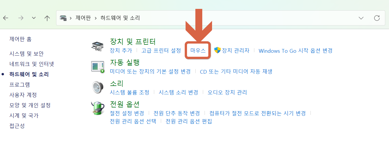 - '하드웨어 및 소리'에서 '마우스(Mouse)' 옵션을 클릭합니다.