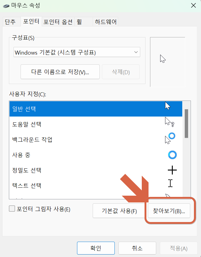 - '찾아보기(Browse…)' 버튼을 클릭하여 컴퓨터에 저장된 사용자 지정 포인터(.cur 또는 .ani 파일)를 선택할 수도 있습니다.