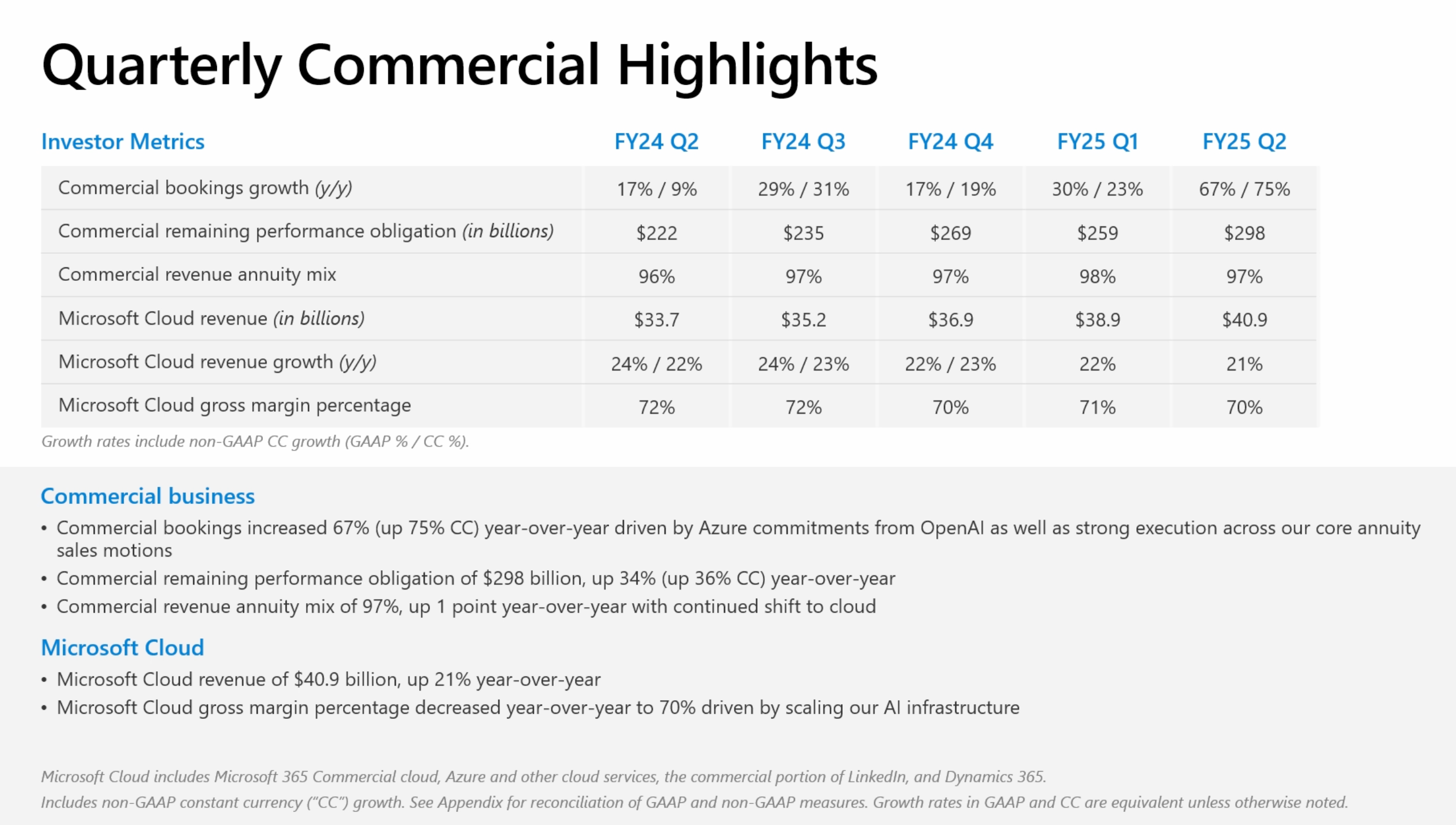 마이크로소프트(Microsoft, MSFT)가 인공지능(AI) 사업의 성장을 기반으로 월스트리트의 기대를 뛰어넘는 2025 회계연도 2분기 실적을 발표했다.