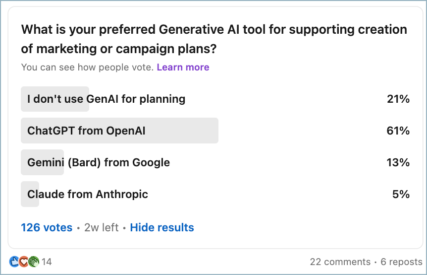 비록 현재의 설문조사에서는 생성 AI 도구를 사용한 마케팅 계획 수립에 대한 질문이 포함되지 않았지만, 최근 LinkedIn에서 진행한 설문조사에서는 많은 마케터들이 이미 AI를 사용하여 마케팅 계획을 지원하고 있다는 것을 알 수 있었습니다. 설문조사 결과, 응답자의 대다수가 AI를 활용하여 마케팅 계획을 수립하고 있다는 점이 매우 놀라웠습니다. AI가 마케팅 계획 수립에 있어 한계가 있지만, 협업 도구로서 계획의 효율성과 품질을 높이는 데 기여할 수 있다는 점은 주목할 만한 발전이라 할 수 있습니다.