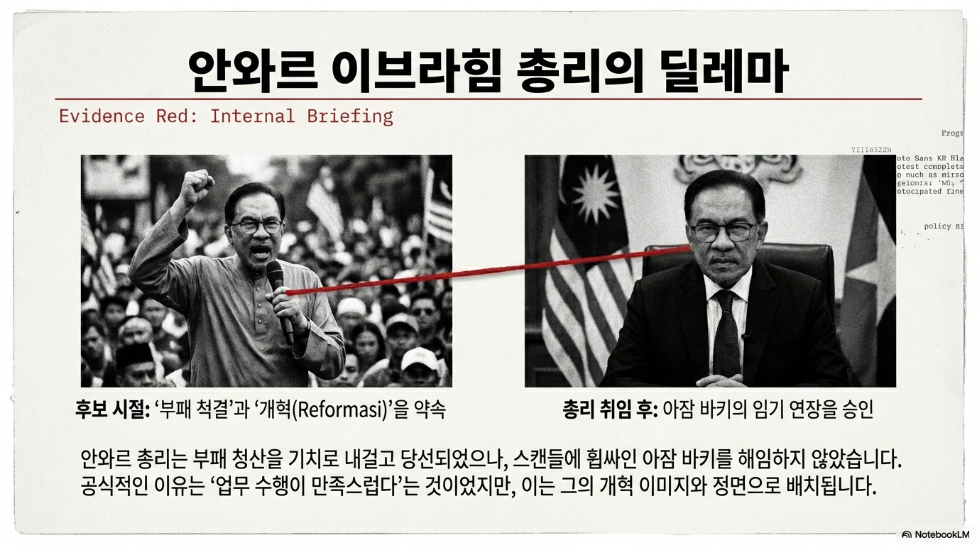 부패 척결을 최우선 공약으로 내걸었던 안와르 이브라힘(Anwar Ibrahim) 총리는 세간의 사퇴 압박에도 불구하고 아잠 바키의 임기를 계속해서 연장해주고 있습니다. 안와르 총리는 그 이유로 아잠 바키의 **"만족스러운 성과(Satisfactory performance)"**를 들었습니다.