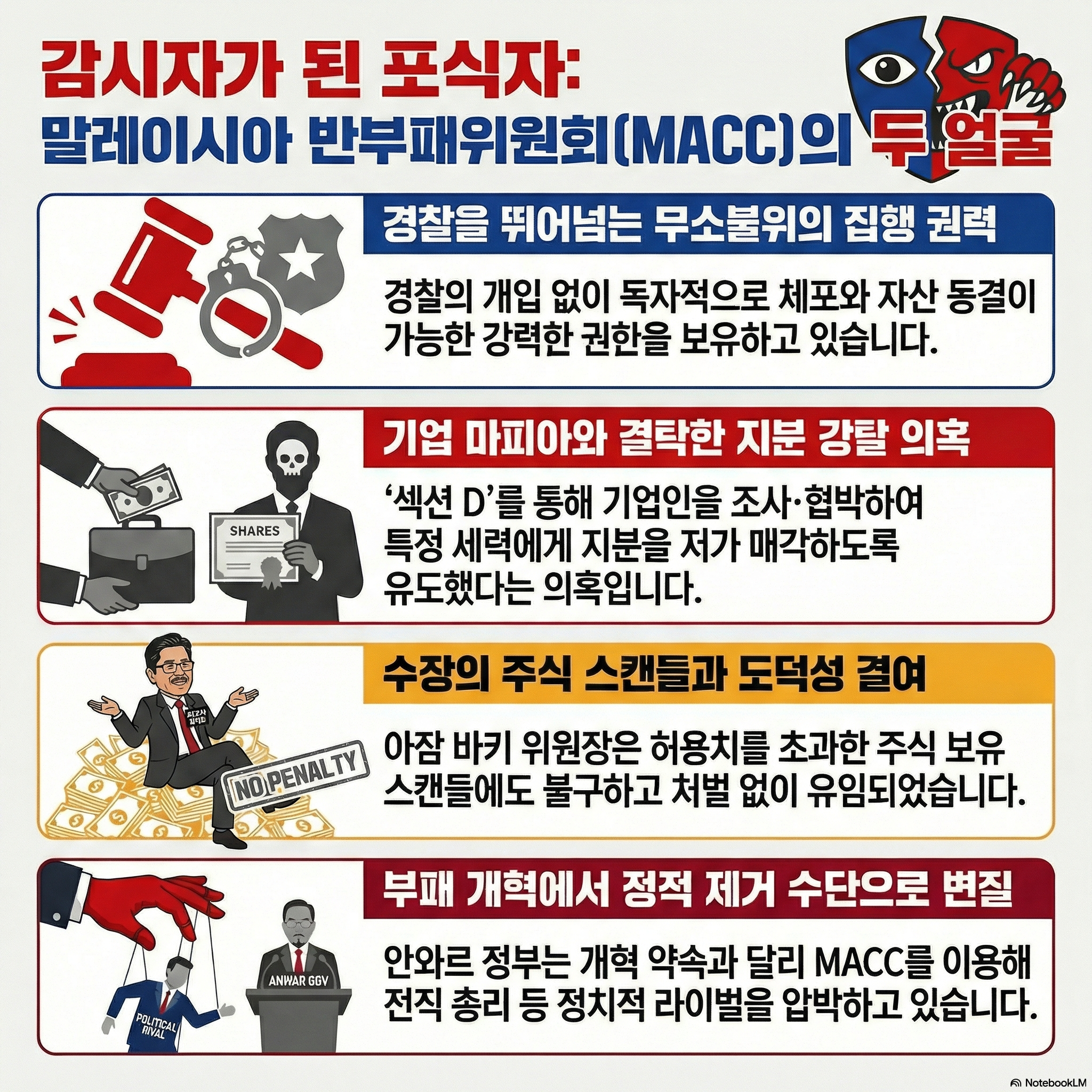 이러한 권한은 사실상 MACC를 '법 집행의 진공 상태'에 놓이게 합니다. 경찰조차 통제할 수 없는 이들의 수사권은 정당한 법 집행의 도구가 아니라, 누군가를 사회적으로 매장하거나 경제적으로 파멸시키기 위한 무기로 오용될 수 있는 위험한 구조를 갖추고 있습니다.
