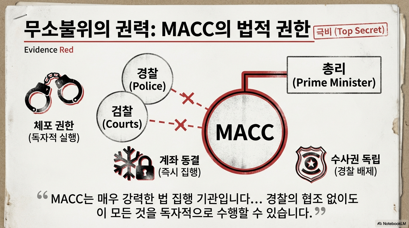 MACC는 현대 민주주의 국가에서 보기 드문, 견제받지 않는 초법적 권한을 누리고 있습니다. 이들은 독자적으로 용의자를 체포하고 은행 계좌를 동결할 수 있는 막강한 법 집행력을 보유하고 있으며, 이 과정에서 일반적인 사법 절차의 감시역인 경찰의 개입이나 협조를 구할 필요가 전혀 없습니다.