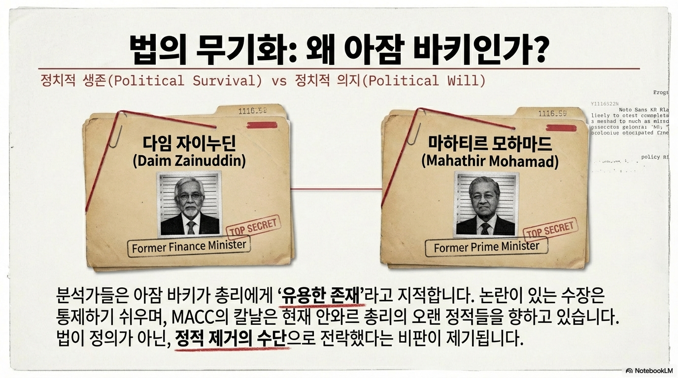 하지만 국제 정치 평론가들의 시각은 다릅니다. 여기서 말하는 '성과'란 부패 척결이 아니라, 안와르의 정치적 라이벌인 마하티르 모하마드와 **다임 자이누딘(Daim Zainuddin)**을 제거하기 위한 '표적 수사'에서의 효율성을 의미합니다. 안와르는 자신의 정치적 생존과 권력 공고화를 위해 MACC를 '정치적 살인 병기'로 활용하고 있으며, 이 과정에서 부패 척결이라는 대의는 권력 유지를 위한 소모품으로 전락했습니다.