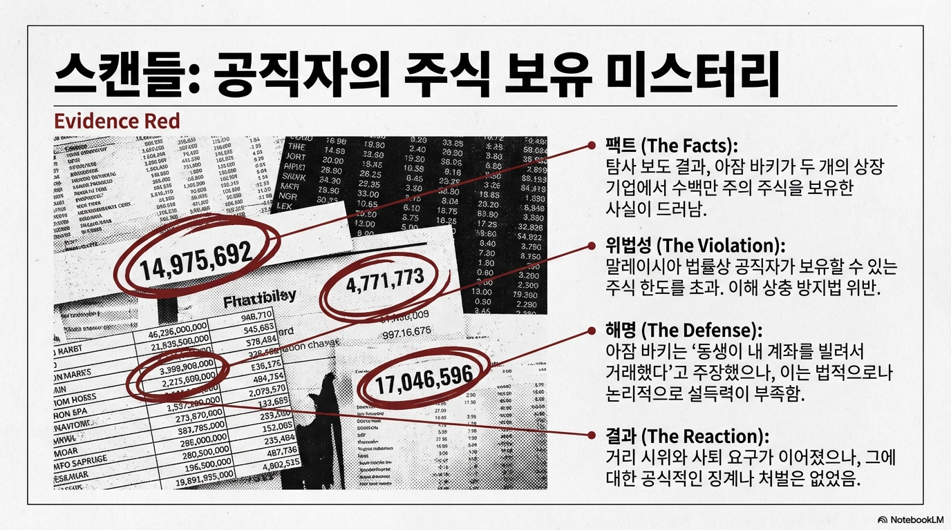 MACC의 도덕적 권위가 완전히 붕괴한 지점에는 현 위원장 **아잠 바키(Azam Baki)**가 있습니다. 그는 공직자 신분으로 수백만 주의 주식을 보유했다는 스캔들에 휩싸였음에도 불구하고 아무런 법적 처벌을 받지 않았습니다.