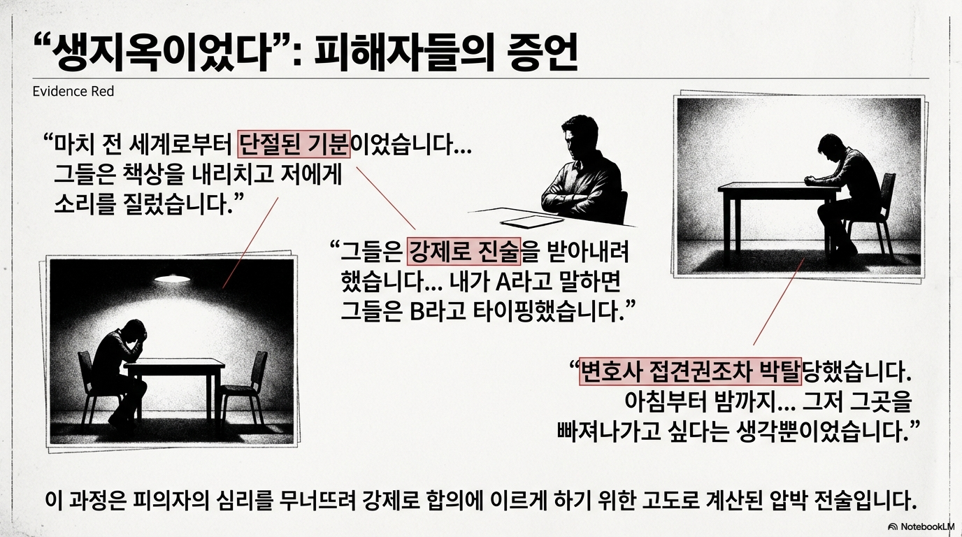 이것은 진실을 밝히는 수사가 아니라, 이미 짜놓은 결론에 피해자를 끼워 맞추는 '심리적 고문'입니다. 공권력에 의한 가스라이팅이 정의라는 이름으로 매일같이 자행되고 있는 것입니다.