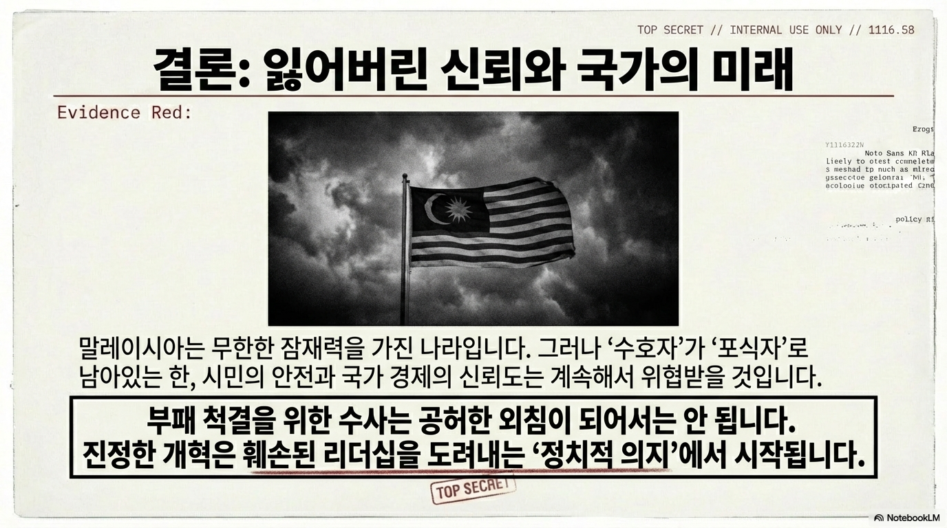 정치적 의지(Political Will)가 권력 유지의 도구로 변질될 때, 국가 기관은 국민을 보호하는 방패가 아니라 국민을 위협하는 칼날이 됩니다. 감시자가 부패하고, 그 부패한 감시자를 권력이 비호할 때, 한 국가의 정의는 어디에서 찾아야 하는가? 이 질문에 답하지 못하는 한, 말레이시아의 민주주의는 거대한 위선 위에 위태롭게 서 있을 뿐입니다.