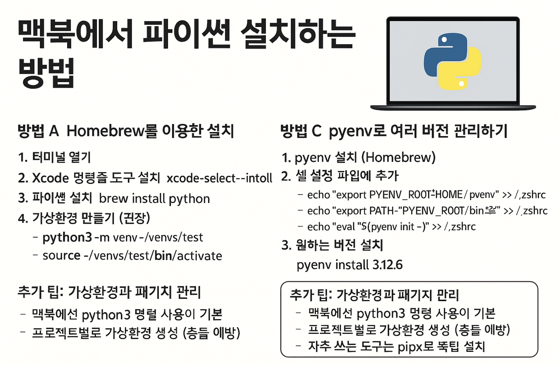맥북에서 파이썬을 설치하는 방법은 크게 Homebrew, 공식 패키지, pyenv 3가지가 있습니다.