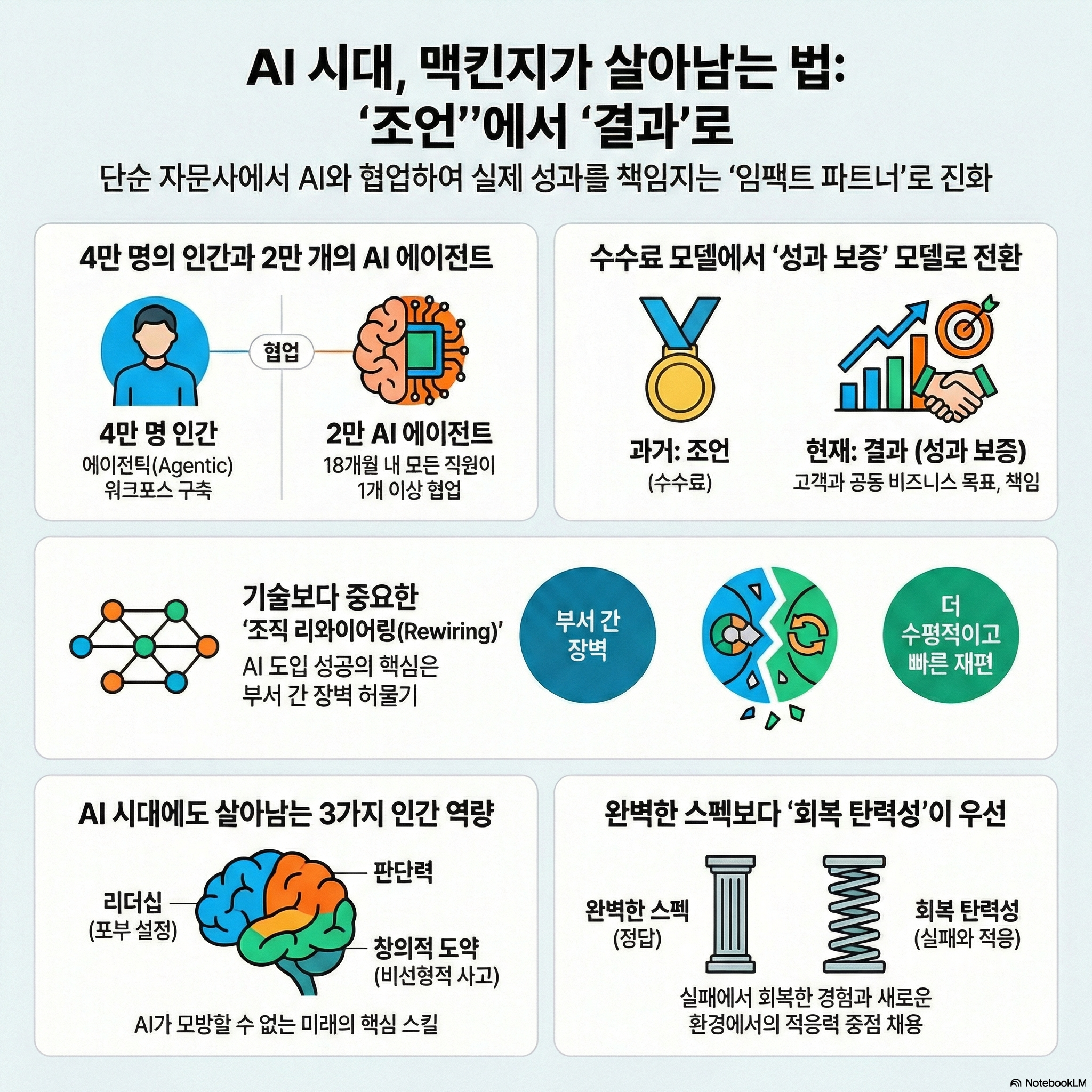 하버드 비즈니스 리뷰와 맥킨지의 글로벌 매니징 디렉터 밥 스턴펠스(Bob Sternfels)의 대담은 "과연 AI가 컨설턴트를 대체할 것인가?"라는 근원적인 질문으로 우리를 이끕니다. 맥킨지는 이 질문에 대해 단순히 기술을 도입하는 수준을 넘어, 지난 100년의 성공 방정식을 스스로 부정하는 파격적인 변신을 시도하고 있습니다. 실리콘의 차가운 지능과 인간의 영혼이 하나의 직조물처럼 엮이기 시작한, 맥킨지의 '자기부정' 전략을 분석합니다.