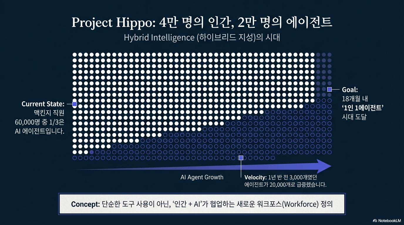 "현재 맥킨지의 구성원은 총 60,000명입니다. 하지만 구체적으로는 40,000명의 인간과 20,000개의 '에이전트(AI)'로 이루어져 있습니다. 불과 18개월 전만 해도 에이전트는 3,000개에 불과했습니다."