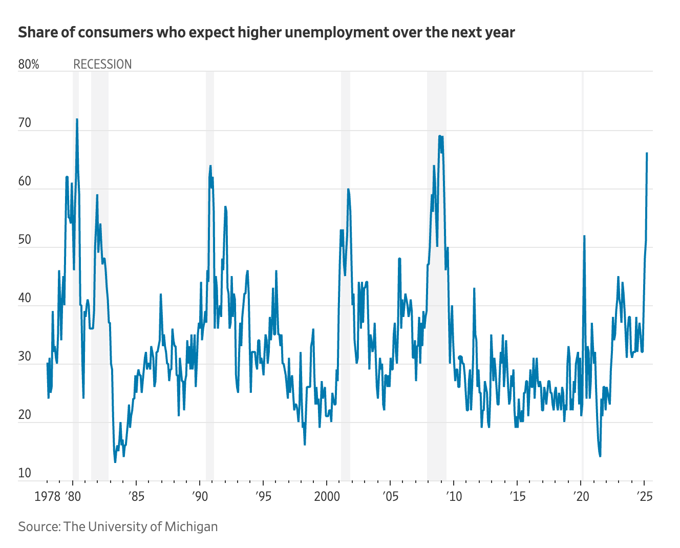 이번 2025년 3월 발표된 미시간대 조사에서는, 향후 1년간 실업률이 오를 것으로 보는 응답 비율이 66%로 급등했는데, 이는 단순히 기분이 나쁘다는 수준을 넘어서 실제 소비 위축으로 이어질 수 있는 구조적 변화의 신호일 수 있습니다.