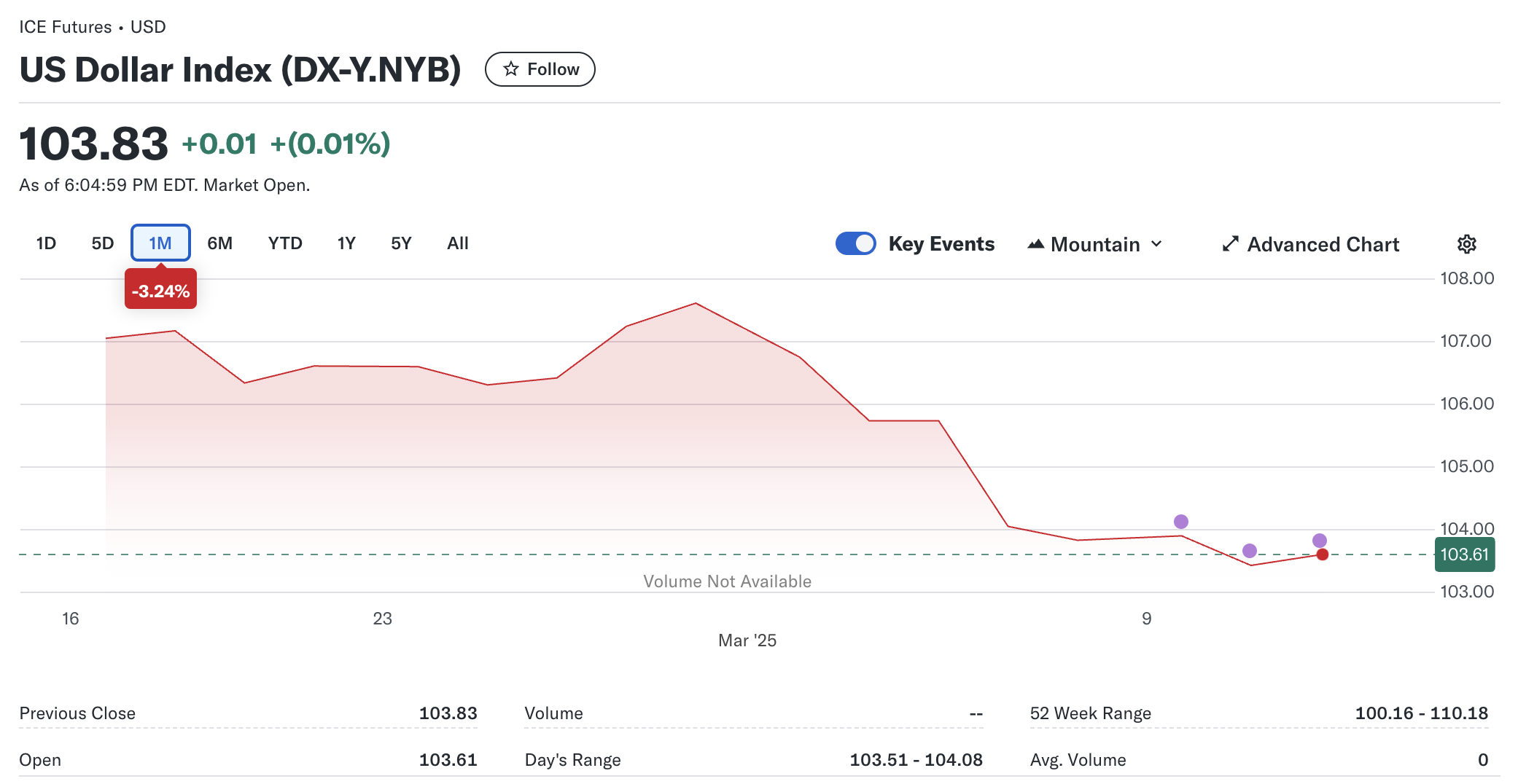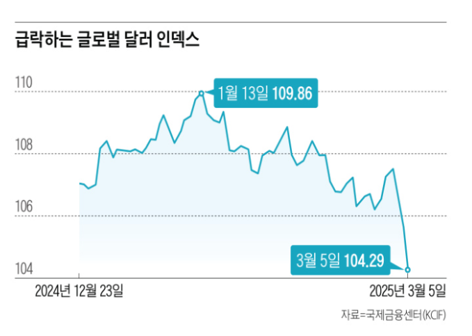 미국 경제의 둔화와 함께 달러 가치도 급락하고 있습니다. 2025년 3월 5일 기준, 글로벌 달러 인덱스는 104.29로 하락하며 최근 몇 개월간 가장 낮은 수준을 기록했습니다. 이는 미국 경제의 둔화로 인해 달러화의 매력이 감소했기 때문입니다.