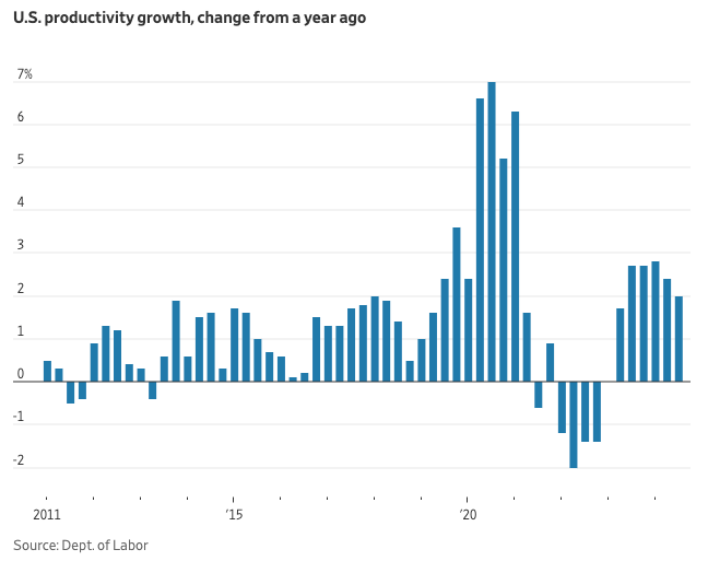 특히, 생산성 성장률이 높은 경제는 더 낮은 비용으로 더 많은 상품과 서비스를 제공할 수 있어 인플레이션 압박을 줄이는 동시에 경제의 성장 잠재력을 확장합니다. 2023년 기준, 미국의 생산성은 5개 분기 연속 전년 동기 대비 최소 2% 이상의 성장률을 기록하며 놀라운 성과를 보여주었습니다. 이는 팬데믹 이전 10년 동안 평균 1%에도 못 미쳤던 생산성 성장률에 비해 크게 개선된 수치입니다.