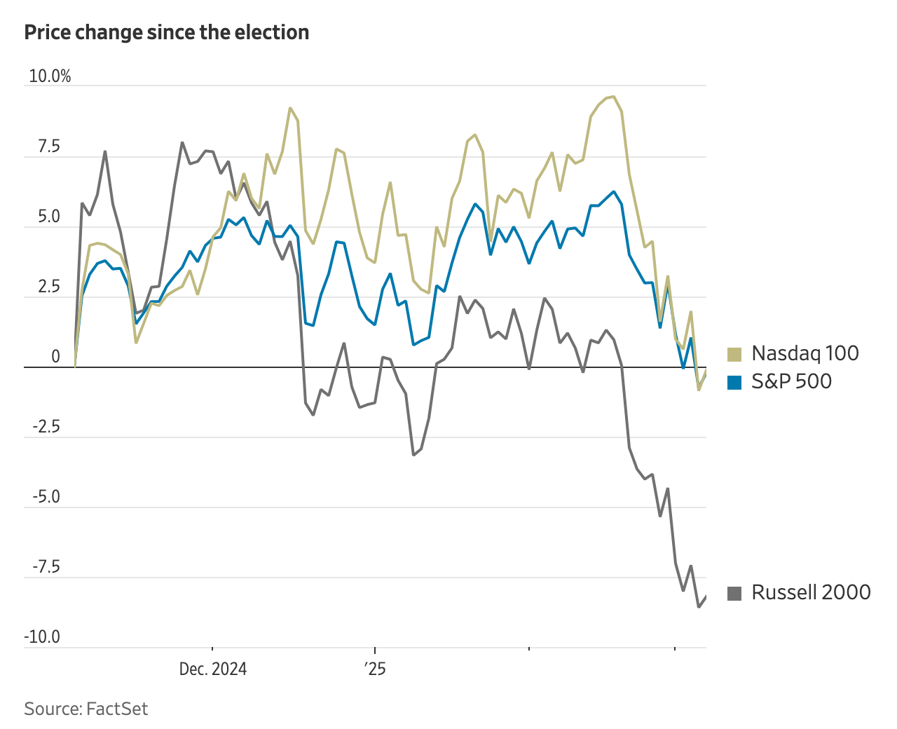 - 나스닥 100과 러셀 2000은 선거 이후 최고점에서 10% 이상 하락했으며, S&P 500 역시 선거일(11월 5일) 당시 수준을 하회하고 있습니다.