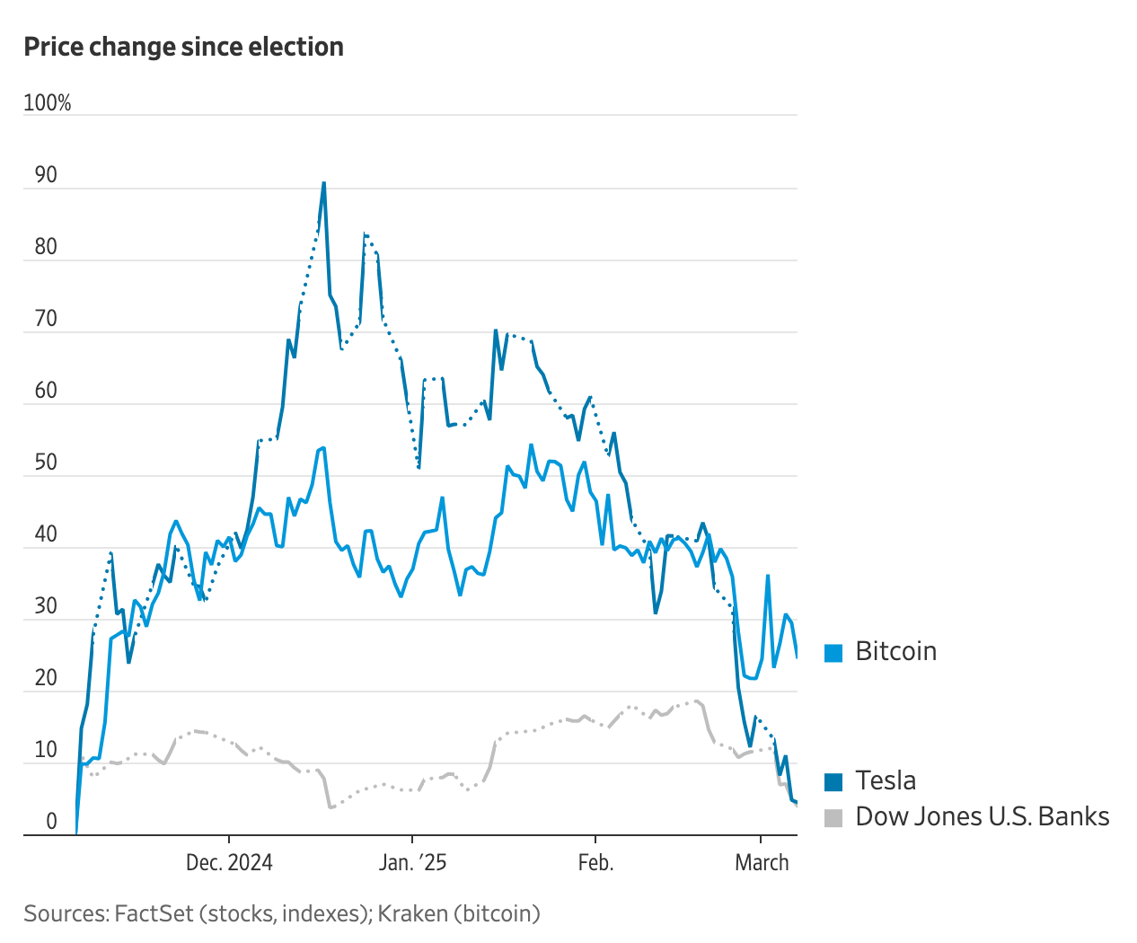 🔺 비트코인은 12월 최고점 대비 18% 하락, 금융주는 선거 이후 19% 상승 후 현재 4% 상승에 그치며 기대감을 반영하지 못하는 중