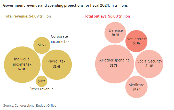 2024 회계연도에 예상되는 연방 정부의 수입과 지출은 각각 4조 8천억 달러와 6조 8천억 달러로, 수입보다 지출이 훨씬 더 많은 상황이다.