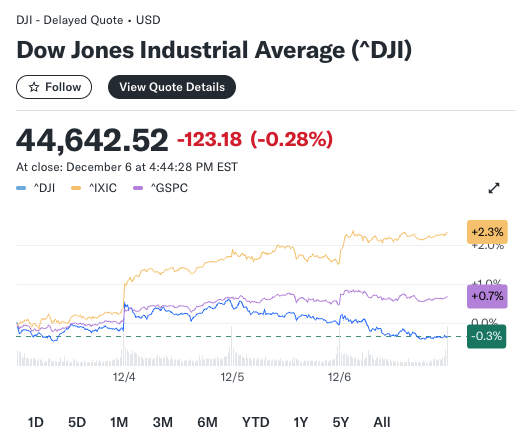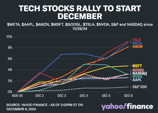 12월 첫 주, 나스닥 지수는 3% 이상 상승하며 기술주의 강세를 보여주었고, S&P 500 지수는 약 1% 상승했습니다. 반면, 다우존스 산업평균지수는 약 0.5% 하락하며 상대적으로 부진한 성과를 기록했습니다.