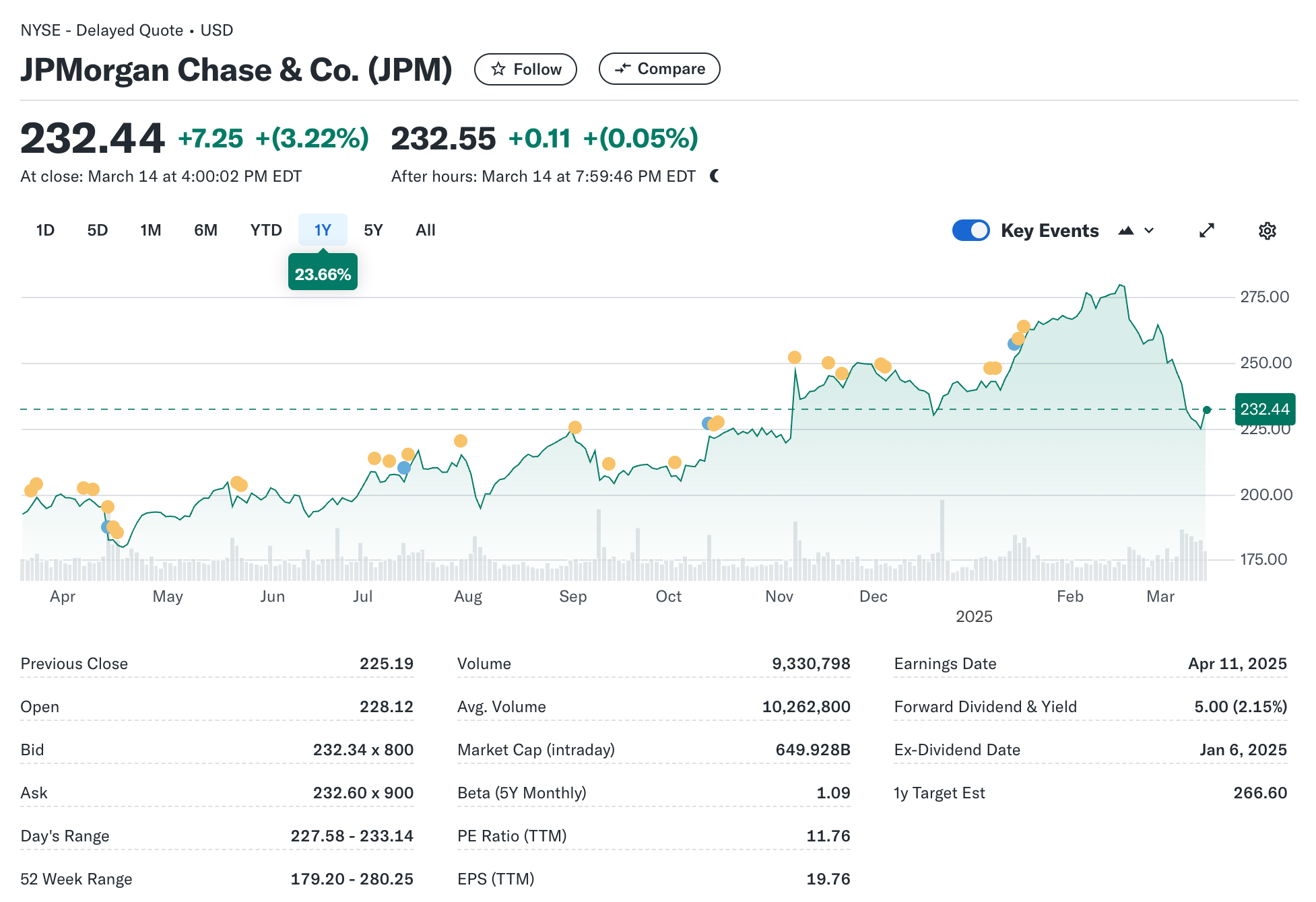 ✅ JP모건(JPMorgan, JPM) – 금융 규제 완화로 인해 은행 실적 개선 가능성