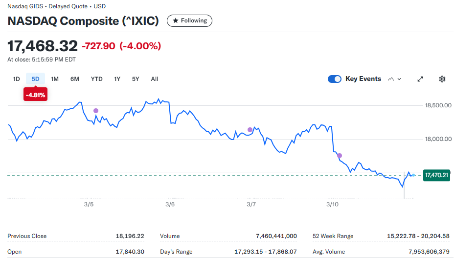 미국 증시가 3월 10일(현지 시각) 큰 폭으로 하락했습니다. 다우지수는 900포인트 가까이 하락, S&P 500은 2.7% 하락, 그리고 나스닥은 무려 4% 폭락하며 투자 심리가 크게 위축되었습니다. 특히, 테슬라는 15%나 급락하며 기술주 전반에 걸쳐 매도세가 강하게 나타났습니다.