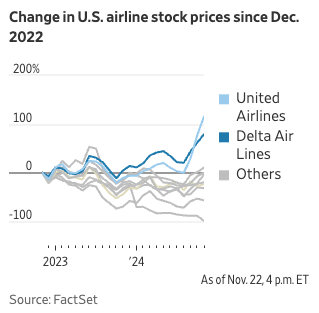 - 유나이티드는 저가 티켓인 **기본 이코노미(Basic Economy)**에서도 추가 수익을 창출하고 있습니다. 기내 반입 가방을 허용하지 않는 대신, 해당 티켓 구매자들에게 추가 비용을 부과하는 방식입니다. 이러한 전략으로 2024년 3분기 기본 이코노미 티켓 판매량은 전년 대비 21% 증가했습니다.