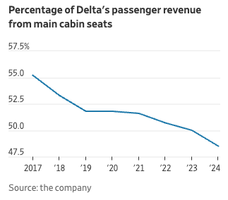 - 델타는 승객 수익의 절반 이상을 프리미엄 좌석 및 부가 서비스에서 창출하고 있습니다. 이는 과거 단순히 일반석 티켓 판매에 의존했던 시기와는 확연히 다른 모습입니다.