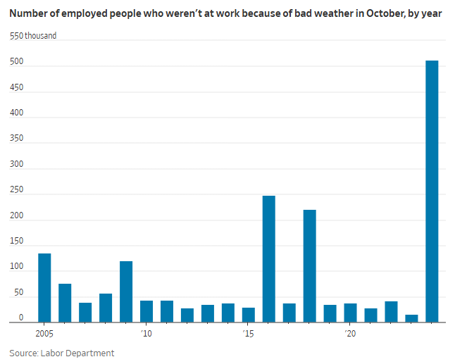 허리케인 헬렌이 플로리다에 9월 말 상륙한 후, 10월 초에 허리케인 밀튼이 추가 피해를 주면서 수십만 명의 노동자가 일시적으로 일자리를 잃었습니다. 이로 인해 10월에만 총 51만 2천 명의 사람들이 악천후로 인해 일을 하지 못했으며, 이들 중 상당수는 실제로는 고용 상태를 유지하되 일시적으로 업무에서 배제되었습니다. 이에 따라 고용 통계에는 일부 오차가 발생할 수 있으며, 이는 향후 수정될 가능성이 있습니다.