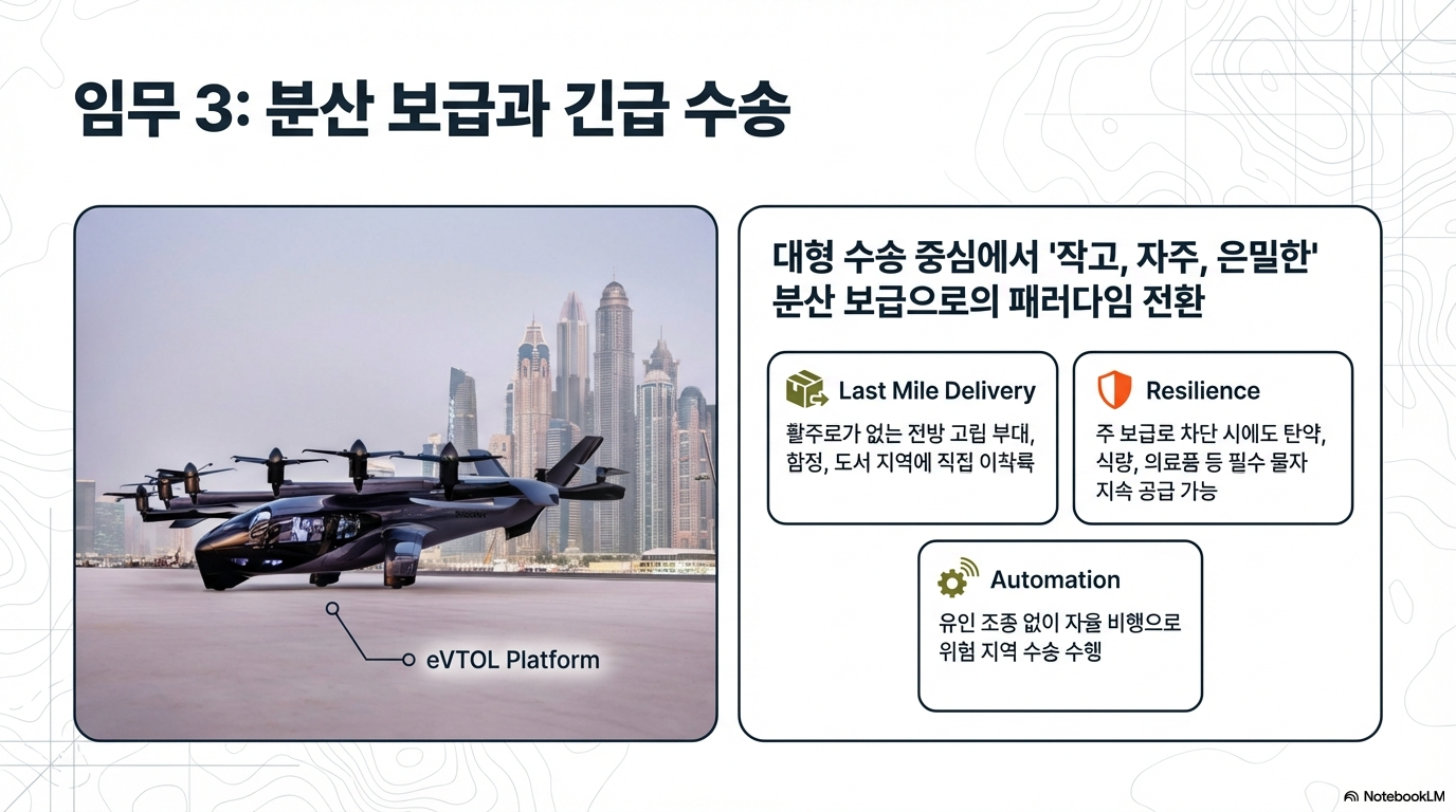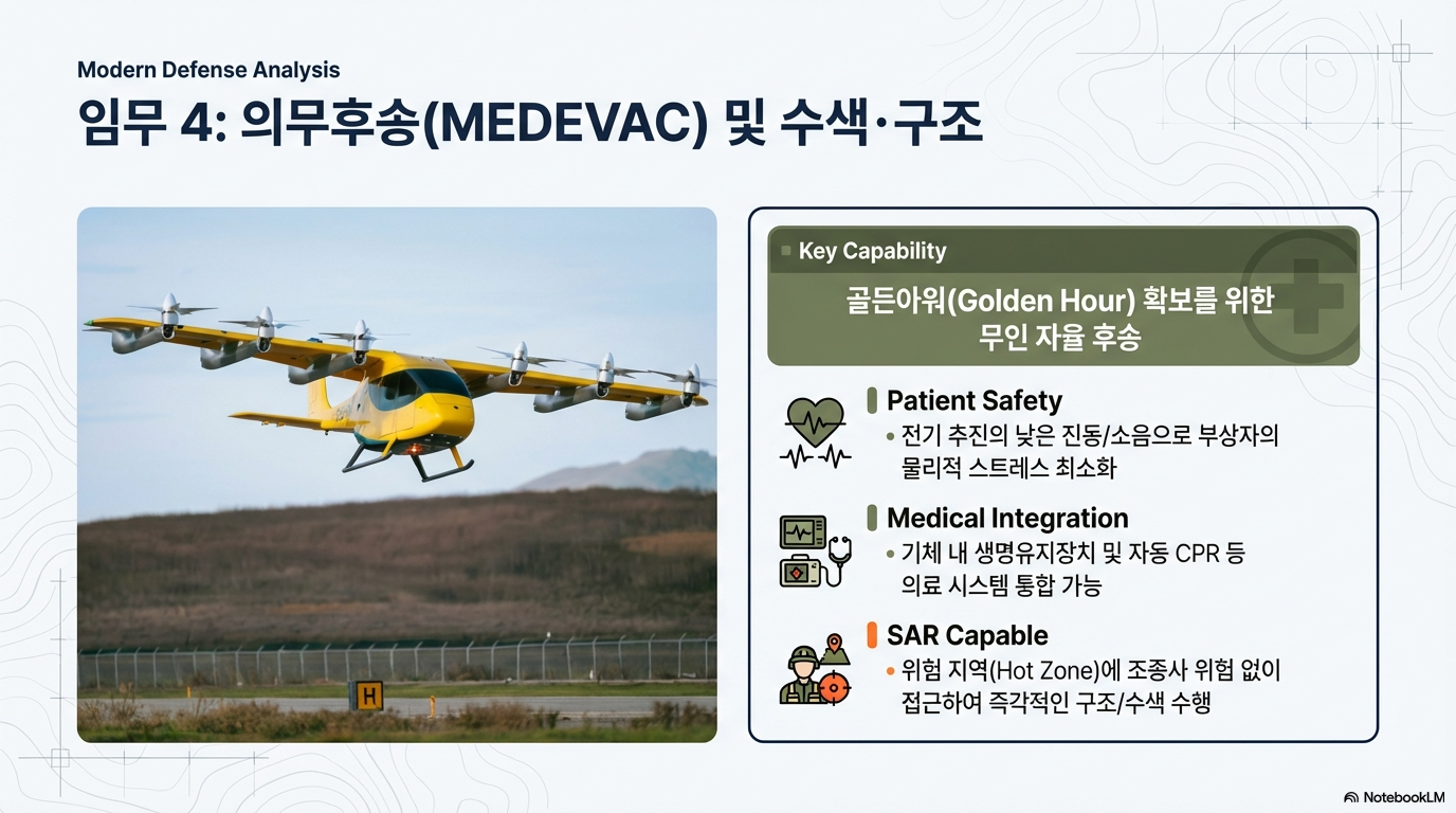 이는 eVTOL이 단순한 수송기를 넘어, 스스로 적을 찾아 파괴하고 아군을 지키는 기동형 타격 및 방어 전력으로 진화하고 있음을 보여줍니다.