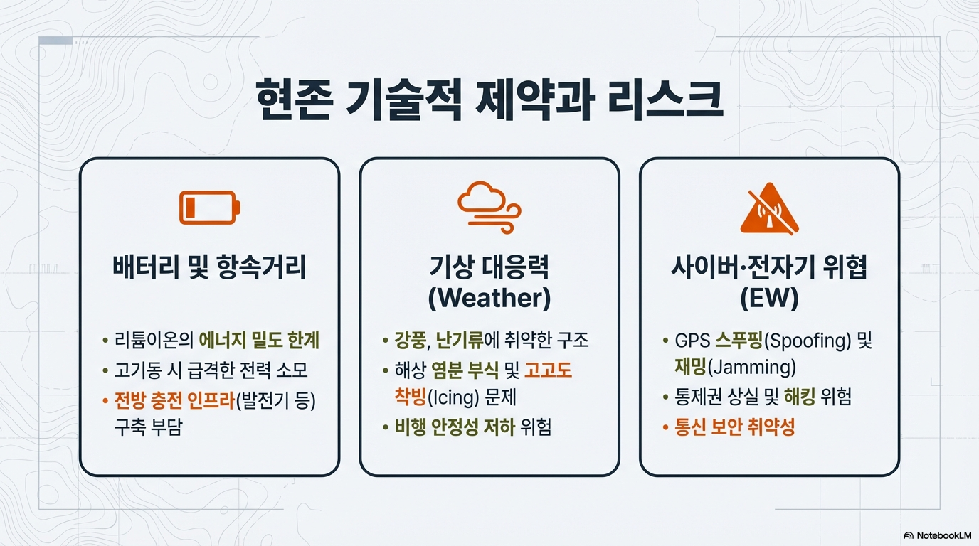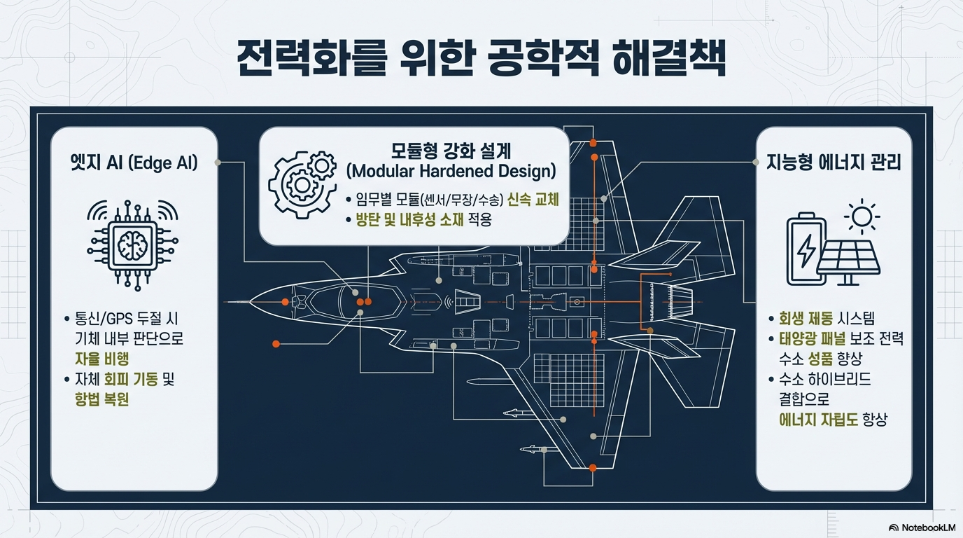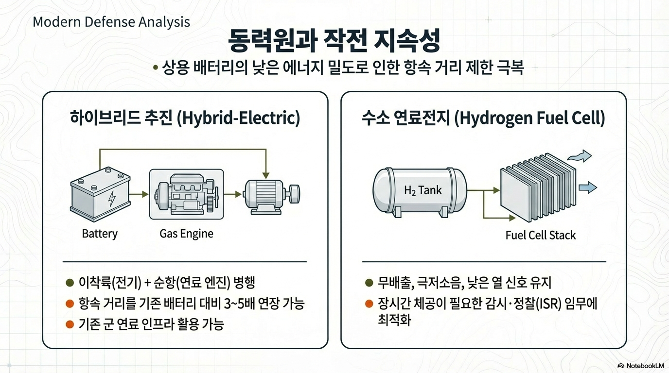 하지만 기술은 이미 대안을 찾고 있습니다. 바로 '하이브리드 추진 시스템'과 '수소 연료전지'입니다. 하이브리드 방식은 기존 엔진과 전기 모터를 함께 사용해 항속 거리를 3배에서 5배까지 획기적으로 늘릴 수 있습니다. 특히 기존 군이 이미 확보하고 있는 연료 공급 인프라를 그대로 활용할 수 있다는 점은 실전 배치와 운용 측면에서 엄청난 이점입니다.